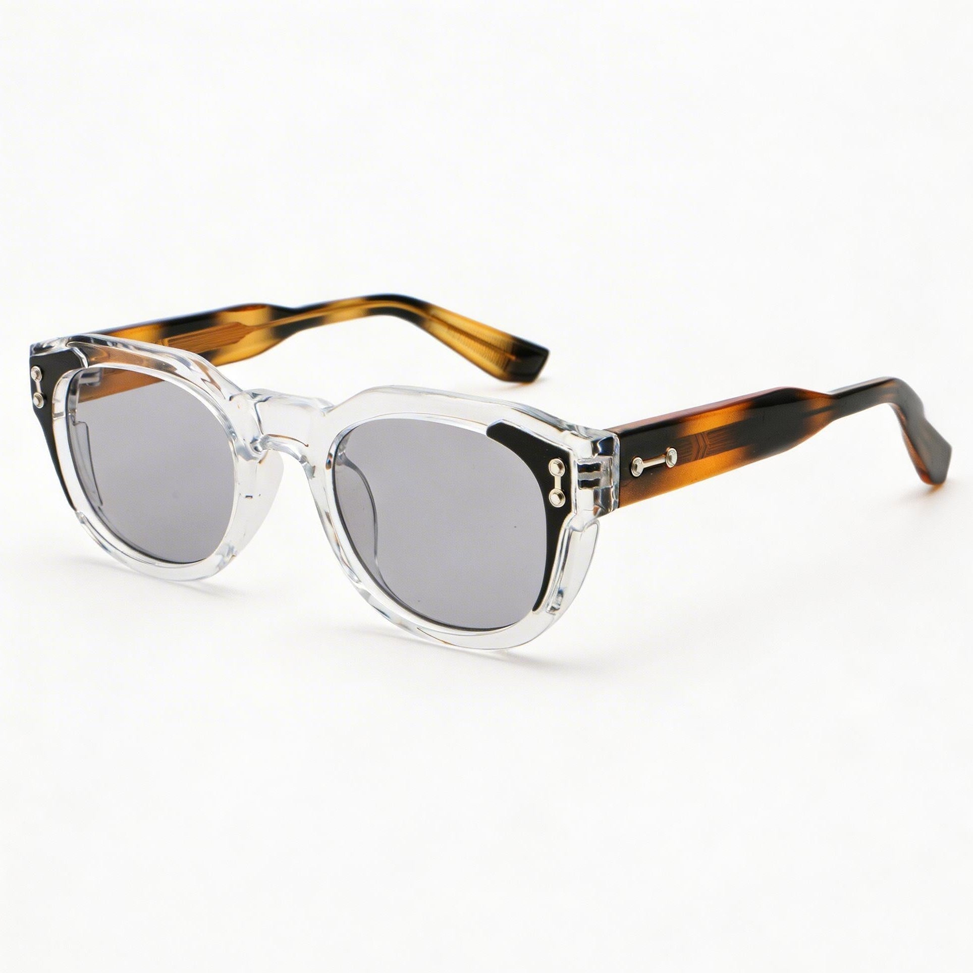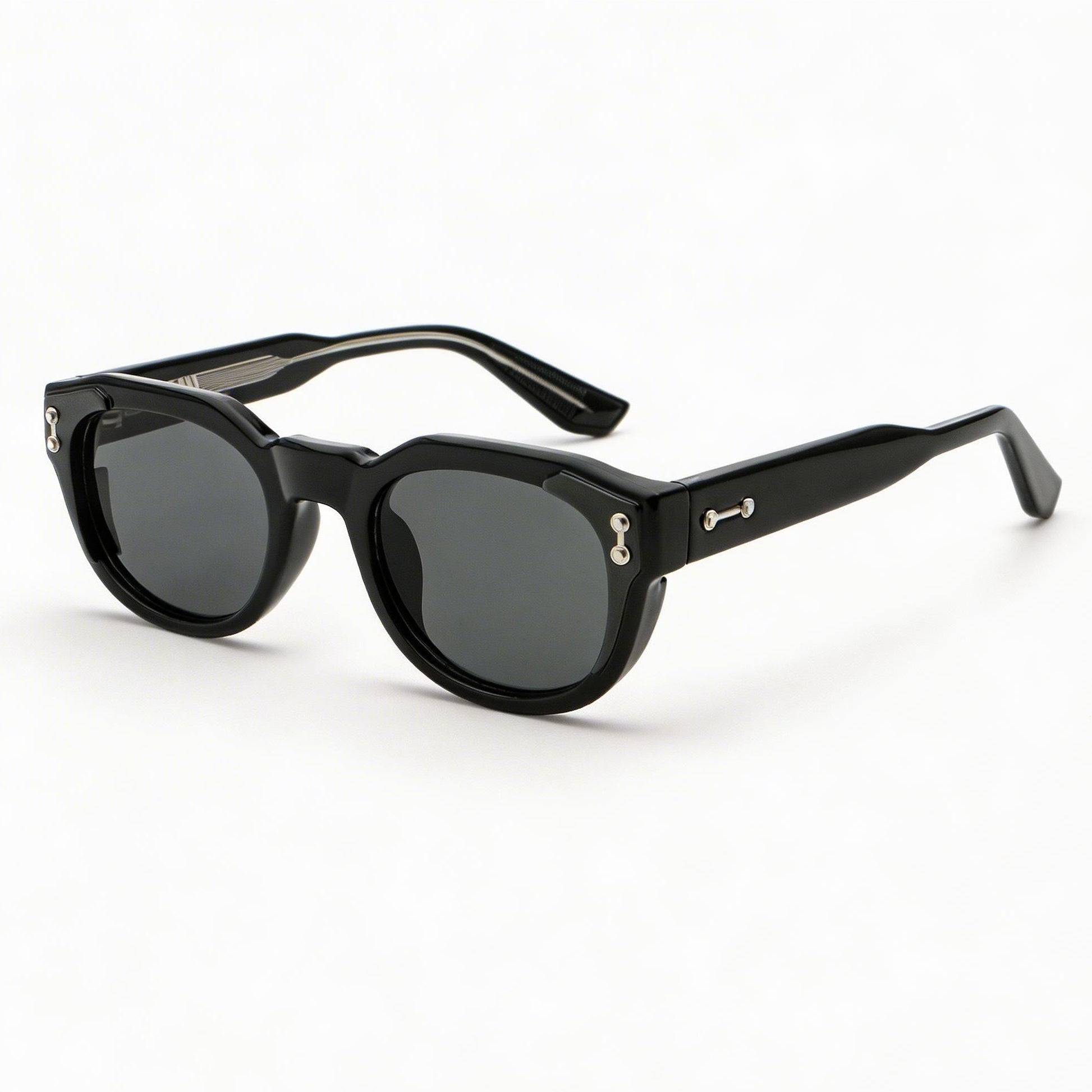 These shades showcase deep, rounded lenses and a designer frame. Custom pin accents at the hinges and temple add a touch of refined detail to the design, while the contoured arms provide structure and a smooth, natural curve, complemented by extended corner cutouts.
